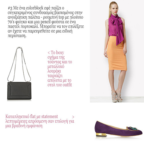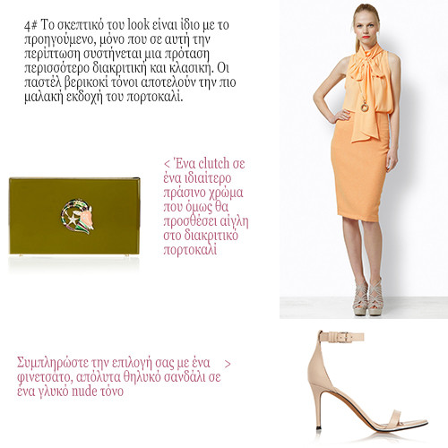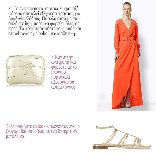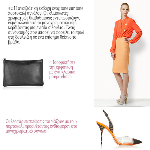 Για όσες δεν φοβούνται να τολμούν επιχειρήστε μονοχρωματικά πορτοκαλί σύνολα παίζοντας με τις υφές ή προσθέτοντας νευρώδη αξεσουάρ για να ισορροπήσετε το γλυκό αυτό χρώμα.