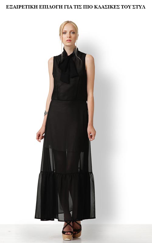 Για τις πιο κλασικές του στυλ, η επιλογή ενός νεορομαντικού φορέματος στην κλασική μαύρη απόχρωση αποδεικνύεται εξαιρετική. Το εκλεπτυσμένο ύφος του, σε συνδυασμό με τις θηλυκές διαφάνειες και τον φιόγκο στο λαιμό να θυμίζει την κομψότητα της δεκαετίας του ΄70, το καθιστά στυλιστικά μοναδικό.Δώστε το προβάδισμα σε αυτό το φινετσάτο φόρεμα, αποφεύγοντας περιττές υπερβολές.