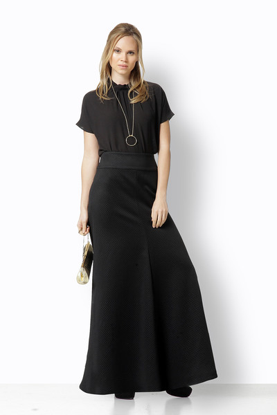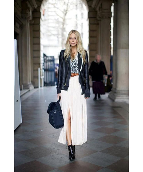 Τις μάξι φούστες συνδυάστε τες με flat μπαλαρίνες – αν είστε ψηλή ή αδύνατη – διαφορετικά με flat μπότες ή μποτίνια. Ένα κοντό σακάκι σε slim fit γραμμή και μια τσάντα ώμου ολοκληρώνουν το llok.