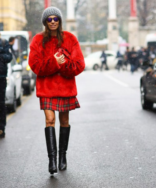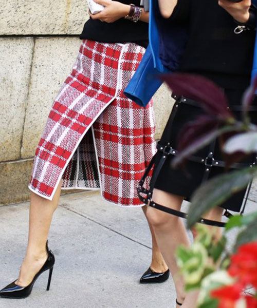 • Η καρό μίντι φούστα φοριέται με λευκό πουκάμισο ή ένα λεπτό πουλόβερ και chunky ψηλοτάκουνα. Το εντυπωσιακό κόκκινο κραγιόν ή τα vampy βυσσινί χείλη συμπληρώνουν την εμφάνιση αυτή με τον εντυπωσιακότερο τρόπο.