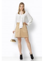 Φούστα μίνι σε χρώμα καμηλό από ύφασμα scuba. Σε πατρόν άλφα, δίνει μια girly νότα στην εμφάνιση σας και είναι πολύ εύκολη να φορεθεί όλη τη μέρα. Έχει δύο τσέπες μπροστά. Το μήκος της είναι 47 εκατοστά. Έχει φερμουάρ από πίσω.